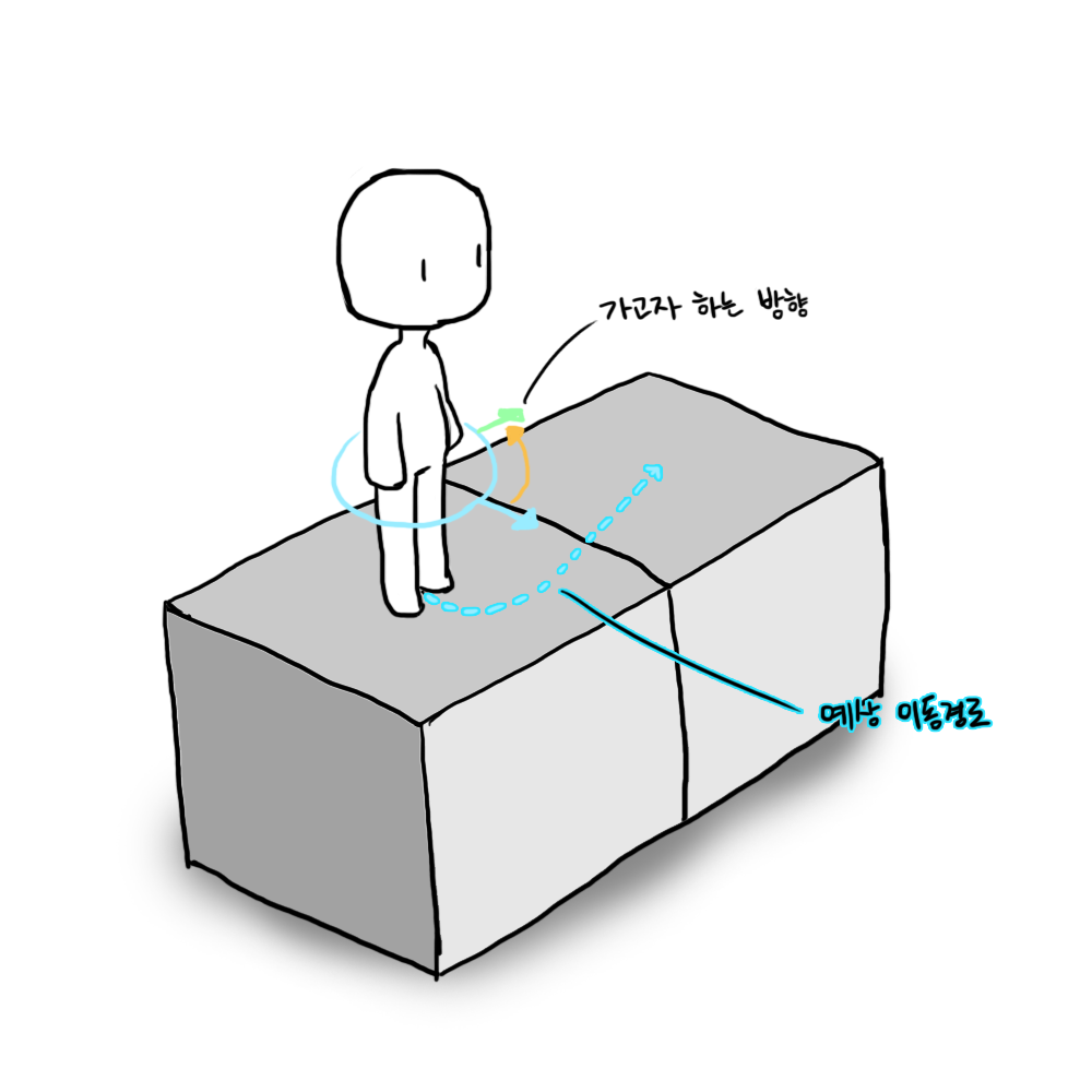 자연스러운 방향전환을 위해서 가고자하는 방향과 실제 캐릭터의 방향을 분리시킨다. 입력받은 방향으로 이동하지만 캐릭터가 서서히 해당 방향으로 회전하면서 이동하기 때문에 이동경로가 곡선으로 자연스럽게 만들어진다.
