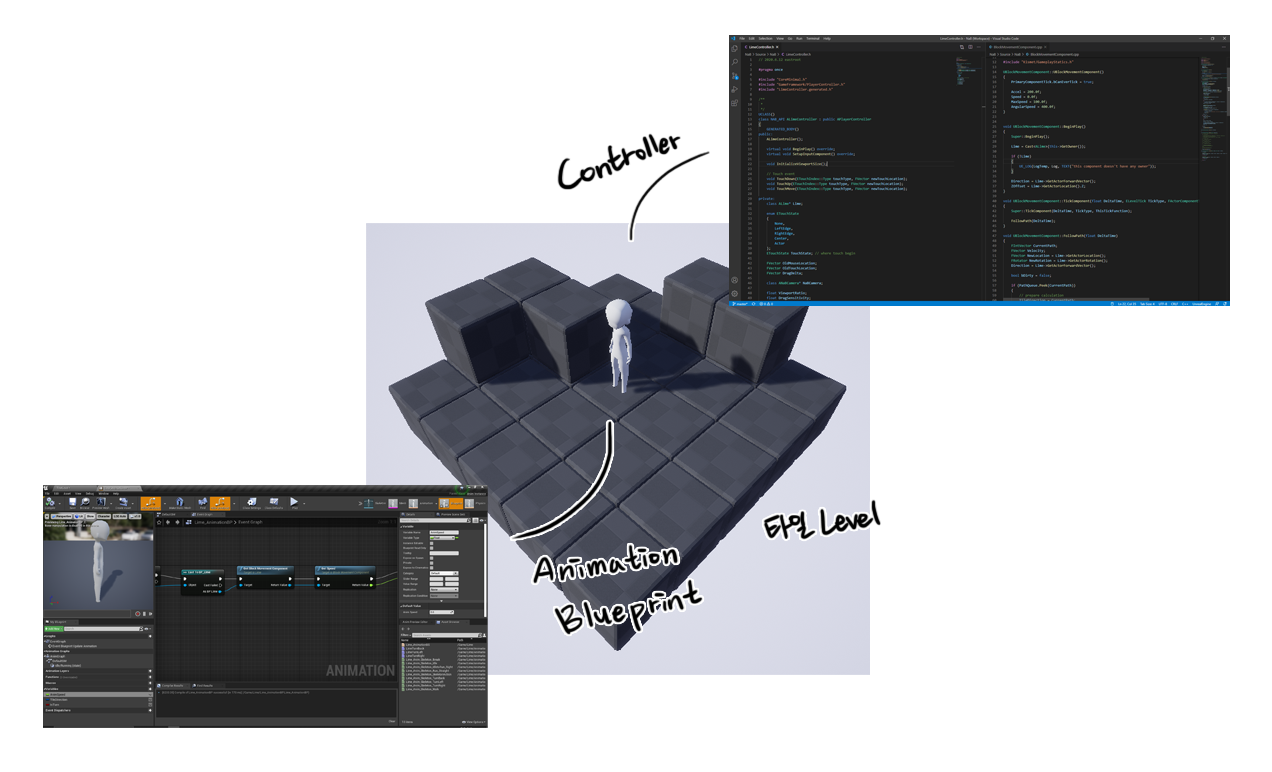 BlockMovement를 바로 구현하기 위해 기본적인 준비물이 몇가지 필요한데, 캐릭터 Mesh와 속도에따라 애니메이션을 재생하는 Blueprint, 그리고 기본적인 맵을 구성한다.