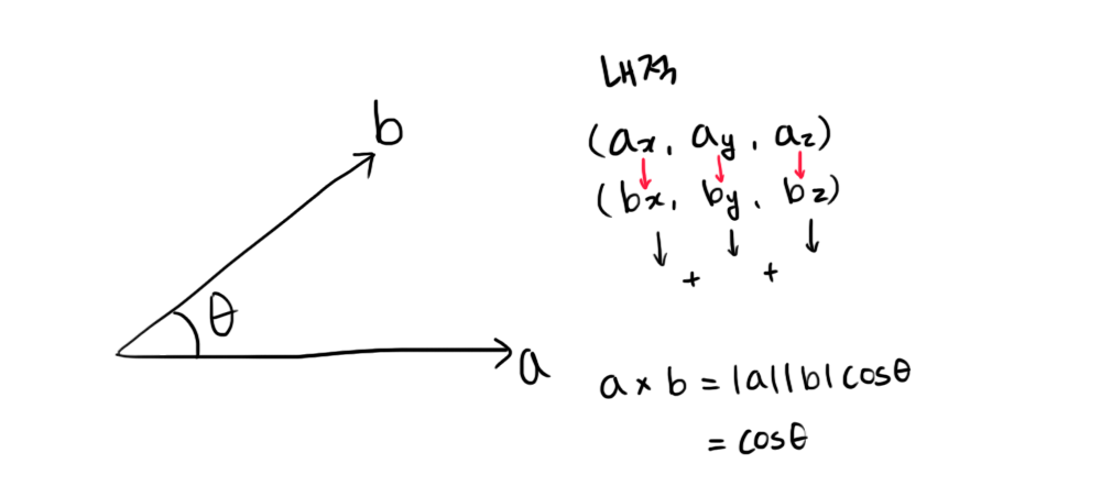 내적으로 두 벡터의 사이각을 구할 수 있는데, 방향은 모두 단위벡터를 사용하기 때문에 벡터의크기는 무시할 수 있다.