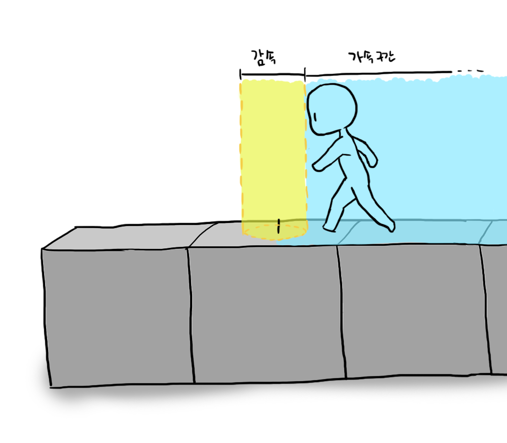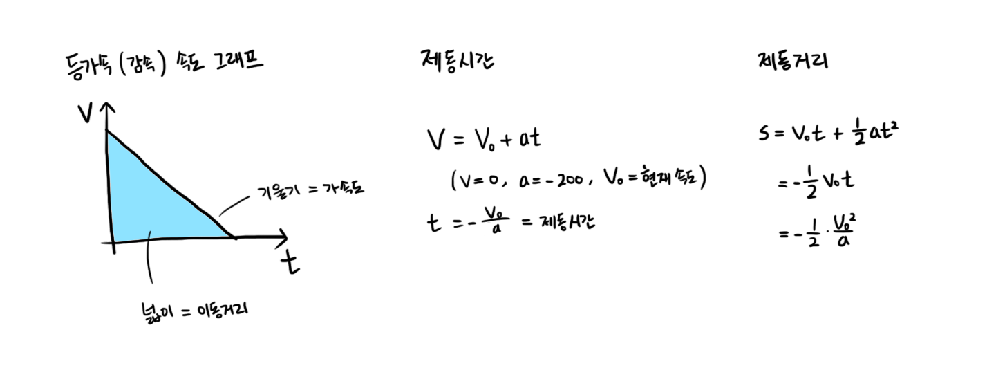 등가속도 공식을 사용하면 현재속도에 대한 제동거리를 계산할 수 있고, 이를 실시간으로 계산해서 언제 멈춰야할지 알고, 서서히 멈추도록 구현한다.