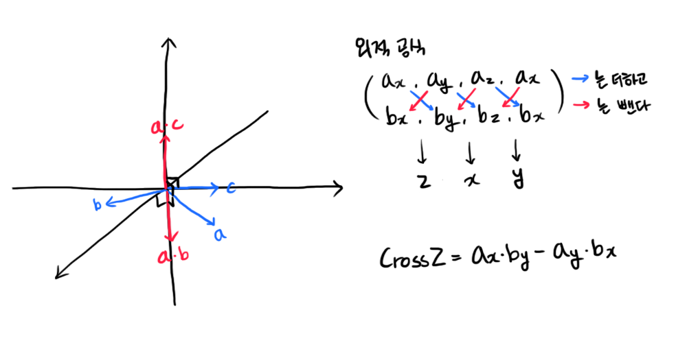 이러한 상황을 방지하기 위해서 내적,외적을 사용하여 회전할 방향을 계산해보자.