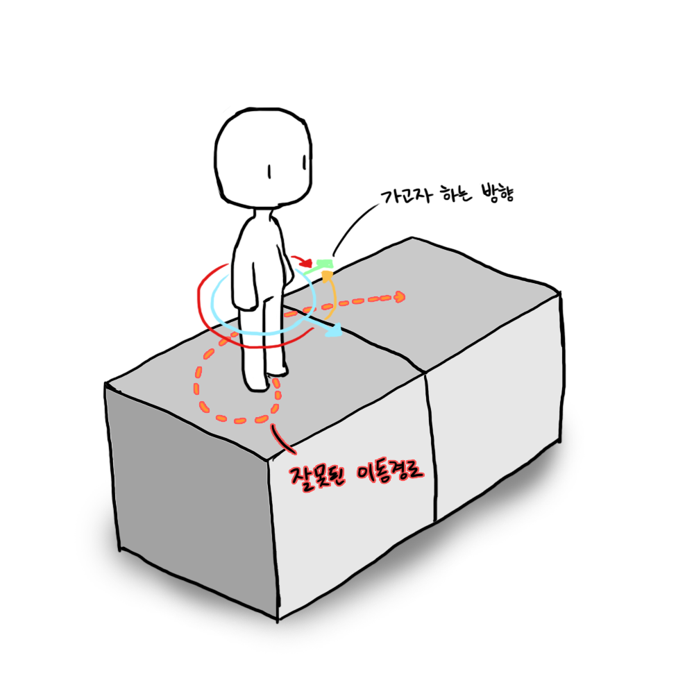 그리고 이동방향을 실시간으로 계산하여 오차가 누적되지않도록 만든다. 이제 어느정도 괜찮아보이지만 남은 문제점이 있다. 이동중에 방향을 전환하면 바라보는 방향이 급격하게 바뀌어서 직선이동을 하게된다. 원하는 것은 자연스러운 이동이니까 이 부분도 개선해보자.