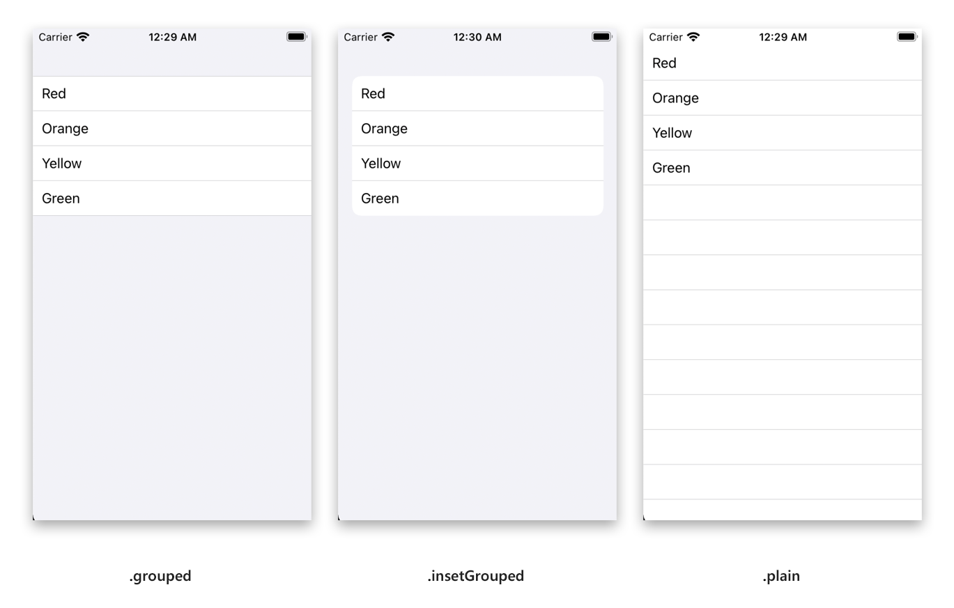 UITableView는 스크롤 할 수 있는 row(행)집합을 그린다. 위아래로 스크롤 할 수 있으며, 기본적으로 .plain, .grouped라는 2가지 스타일을 제공한다. plain은 row에 채울 데이터 값이 없어도 table을 그리지만 insetGrouped와 grouped의 경우 필요한 row만 그리고 나머지는 공백으로 그린다.