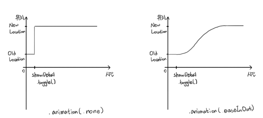 showDetail을 변화시키는 연산 자체에 animation을 걸어버리면 showDetail의 변화 자체가 선형보간되기 때문에 이 값과 연결된 다른 값들이 같은 animation을 적용시킨것과 같은 효과를 낸다.