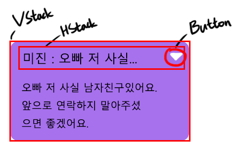 먼저 리스트를 채울 노드를 만들어 보자. Stack으로 레이아웃을 구성하고 우측에 버튼을 추가한다.